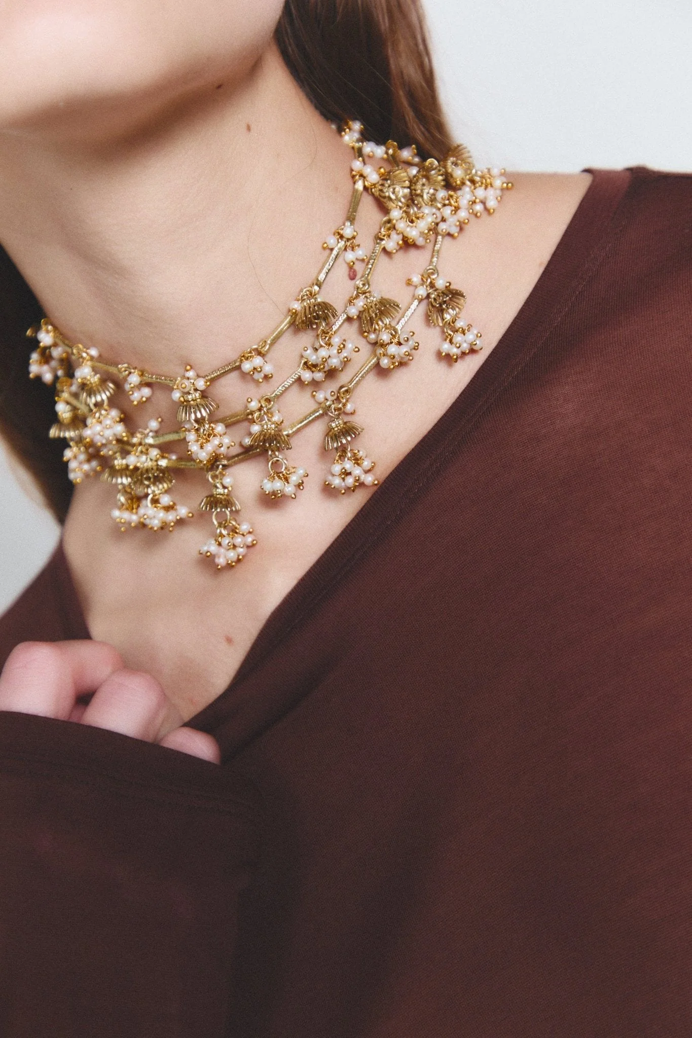 Choker de metal con acabado dorado con abalorios de resina blancos.