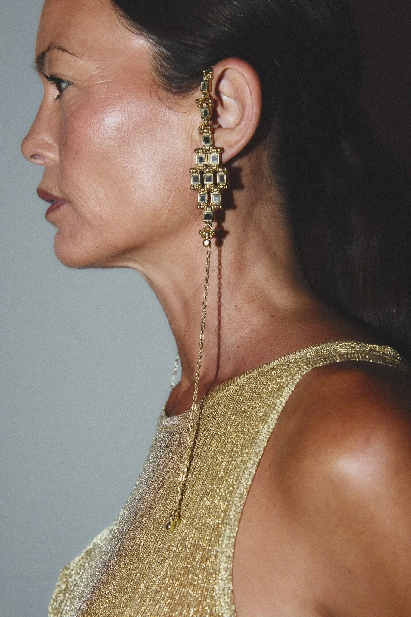 BEST SELLER. Pendientes más icónicos de metal con acabado dorado y espejos incrustados a mano. Se vende el par.