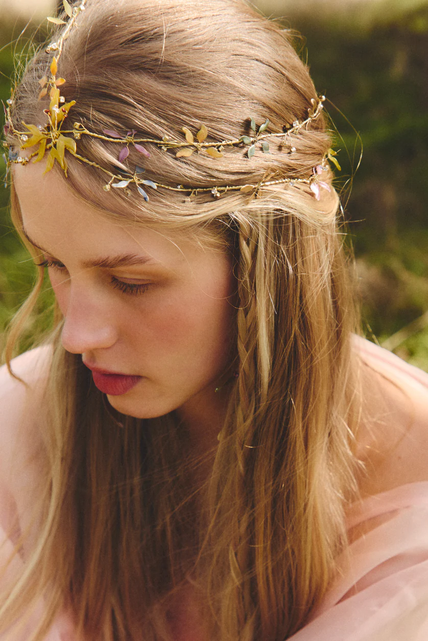 Materiales: Hilo de alpaca en latón y cobre con baño de plata. Capas infinitas creadas a través de un minucioso proceso de superposición de barnices y tintes que aportan profundidad y color. Cierre de hilo compuesto por un 67% de algodón y un 33% de rayón. Detalles con piezas de cristal checo, strass y abalorios cuidadosamente seleccionados.