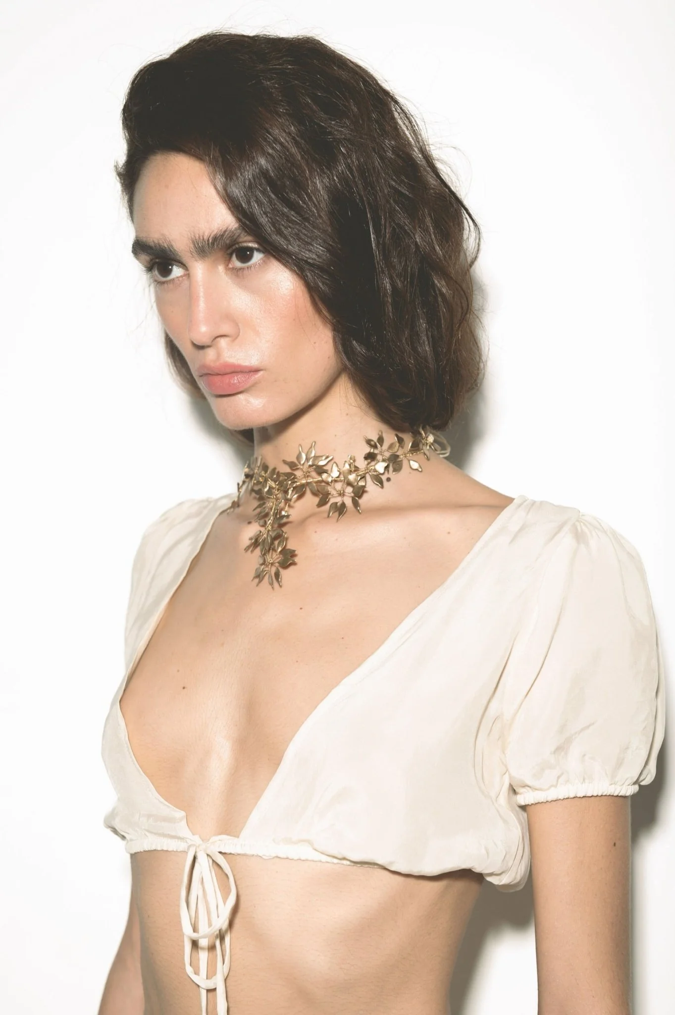 Materiales: Hilo de alpaca en latón y cobre con baño de oro. Capas infinitas creadas a través de un minucioso proceso de superposición de barnices. Cierre de hilo compuesto por un 67% de algodón y un 33% de rayón. Detalles con piezas de cristal checo, strass y abalorios cuidadosamente seleccionados.