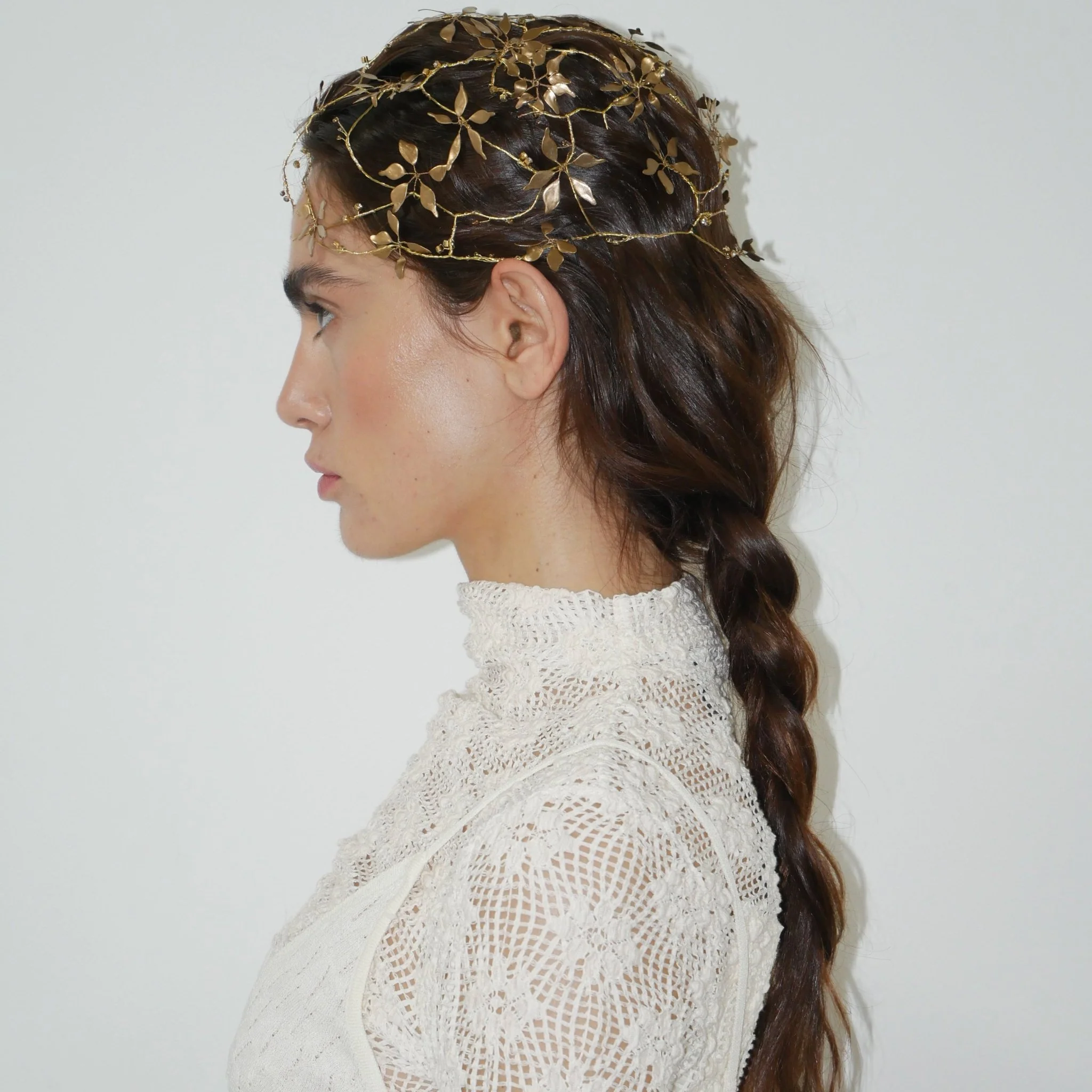 Materiales: Hilo de alpaca en latón y cobre con baño de oro. Capas infinitas creadas a través de un minucioso proceso de superposición de barnices. Cierre de hilo compuesto por un 67% de algodón y un 33% de rayón. Detalles con piezas de cristal checo, strass y abalorios cuidadosamente seleccionados.