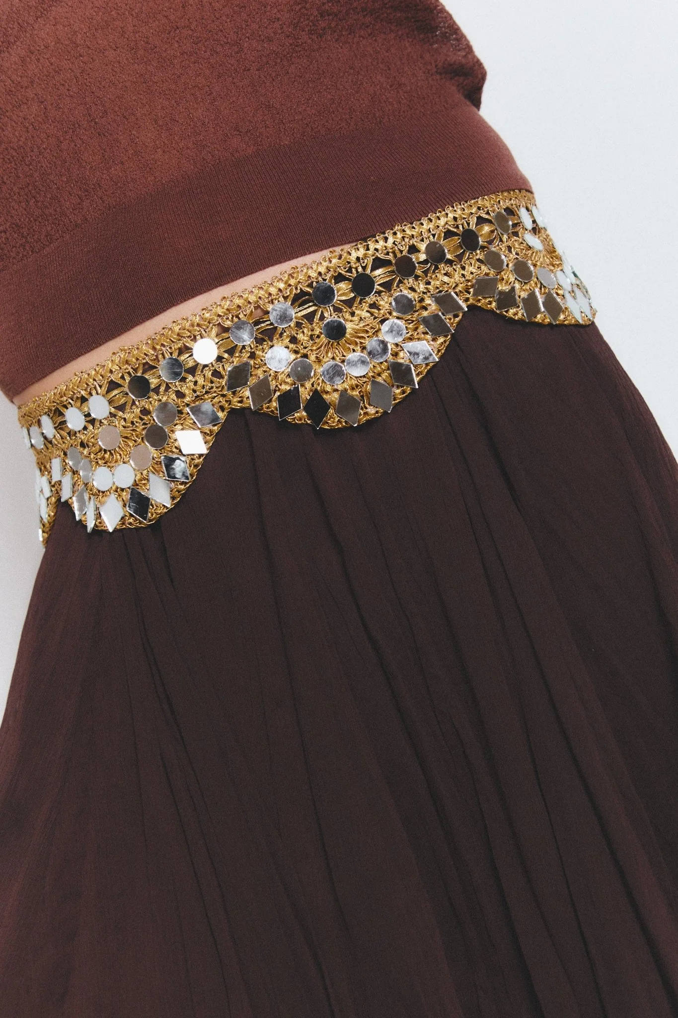 - Materiales: Crochet hecho a mano con hilo metalizado y piedras de espejo selladas una a una.