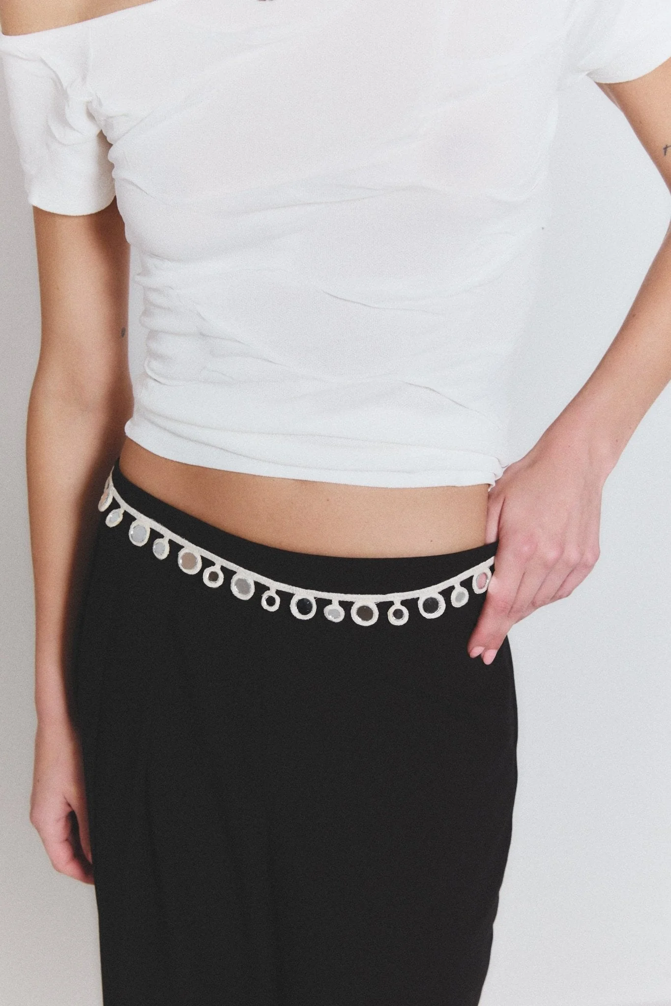 - Materiales: Hilo blanco y piedras de espejo selladas una a una.