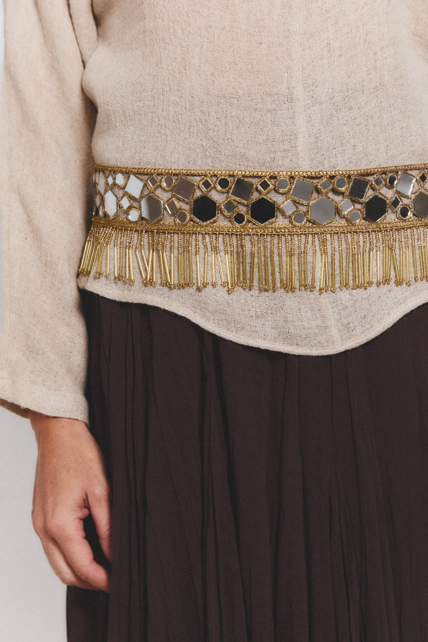 Pieza artesanal que destaca no solo por su diseño único y original, si no por su peso ligero y delicadeza. Esta joya única realizada con espejos y con piedras cosidas a mano en forma de cascada, atrapa la luz e ilumina cada paso creando un juego hipnotizante de reflejos. ¡Deslumbra en cualquier ocasión!