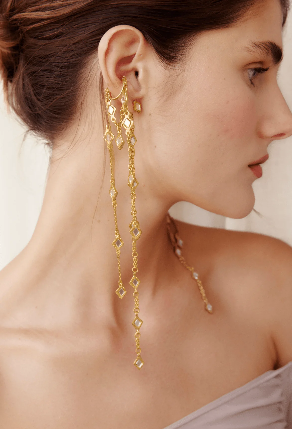 Earcuff de latón con baño de oro, compuesto por una cadena que cae en tres diferentes longitudes. Cada cadena presenta una secuencia de pequeños espejos en forma de rombo, engarzados a mano. La estructura superior se ajusta a la oreja sin necesidad de agujero. Diseñada para lucirse sola o acompañar a otros pendientes.