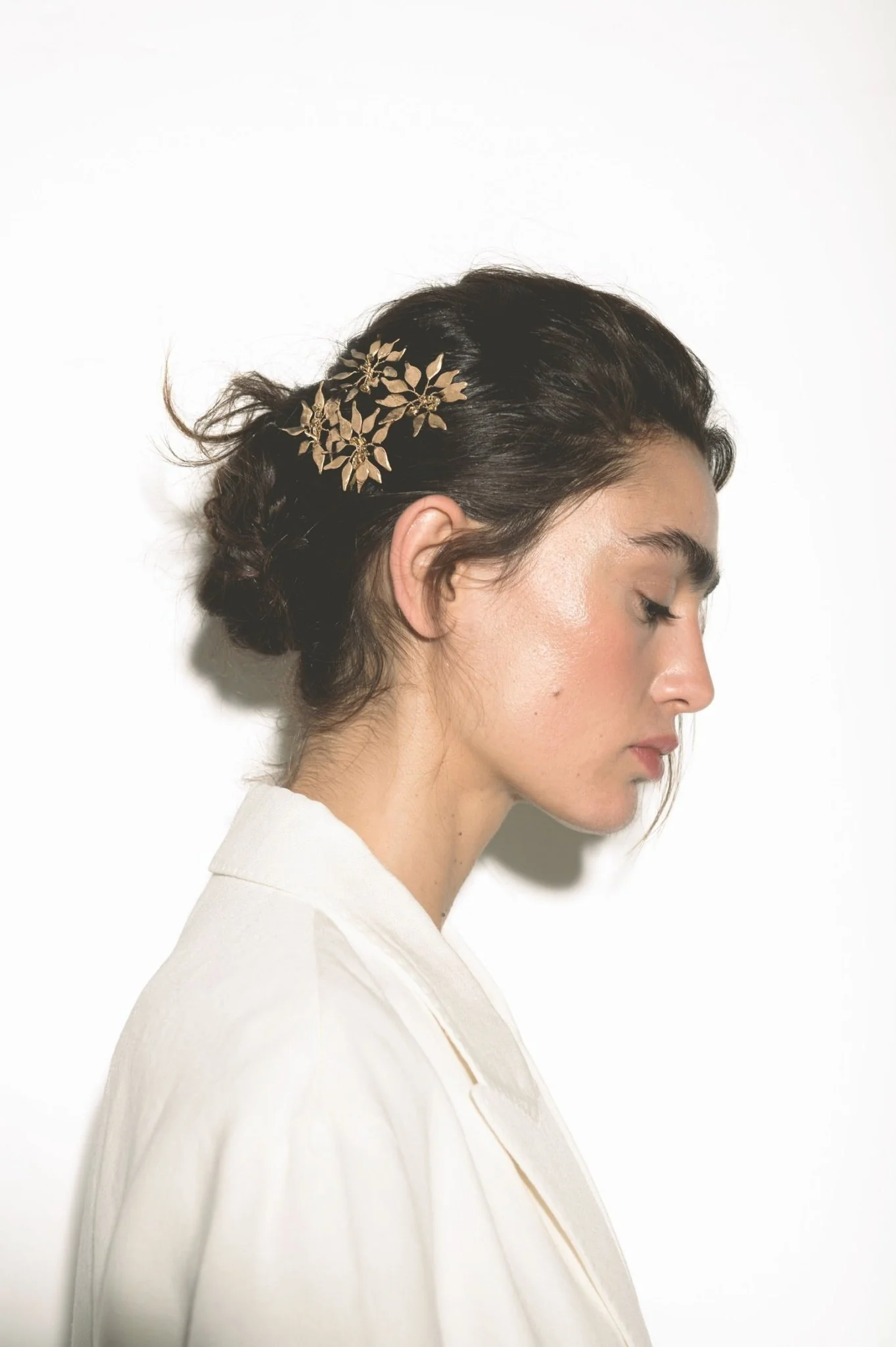 Materiales: Hilo de alpaca en latón y cobre con baño de oro. Capas infinitas creadas a través de un minucioso proceso de superposición de barnices. Cierre de hilo compuesto por un 67% de algodón y un 33% de rayón. Detalles con piezas de cristal checo, strass y abalorios cuidadosamente seleccionados.